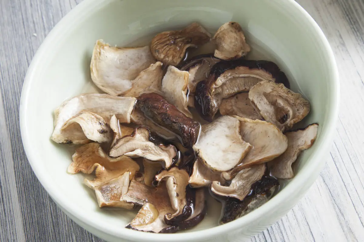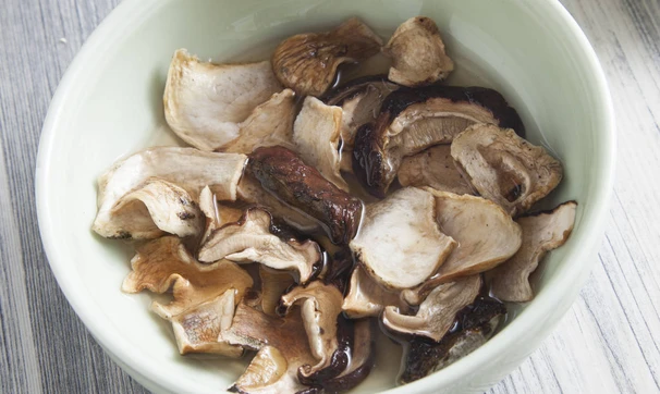 Грибы залейте небольшим количеством кипятка (около 50 мл) и оставьте набухать.