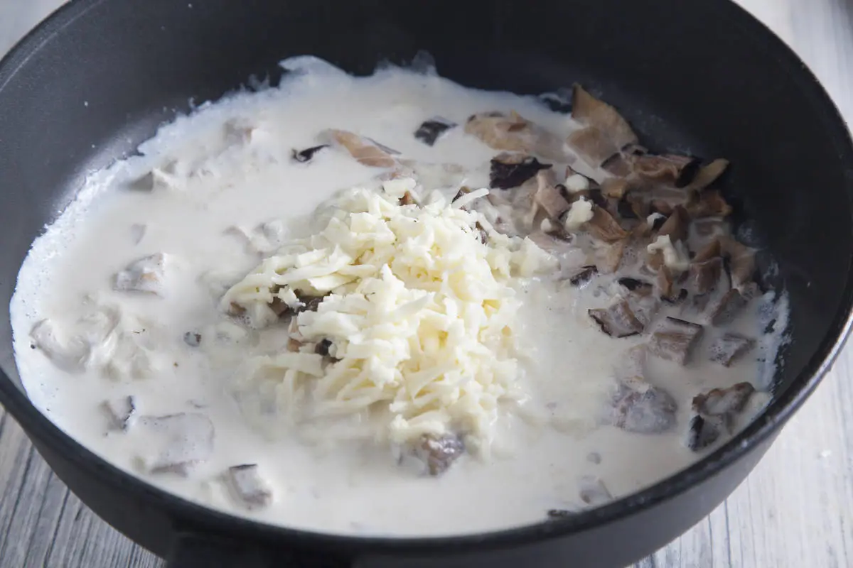 Вскипятите воду для лапши. Грибы выньте из воды, мелко нарежьте, выложите в сотейник и прогрейте вместе со сливками и тертым сыром, не доводите до кипения. Отварите лапшу, переложите ее в соус и перемешайте. Приятного аппетита!