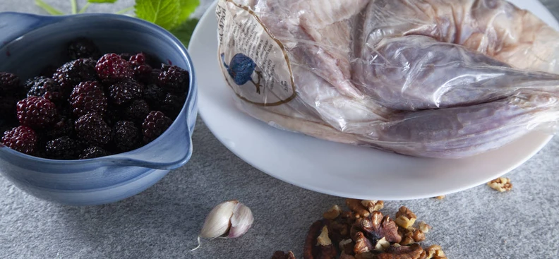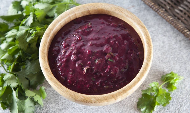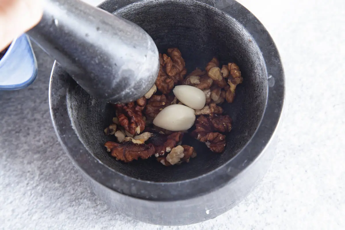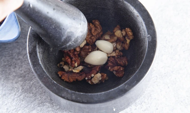 Грецкие орехи, чеснок и соль измельчите до однородности в блендере или разотрите в ступке, соедините с мякотью ежевики, добавьте лимонный сок и перемешайте.