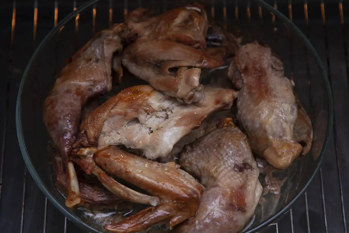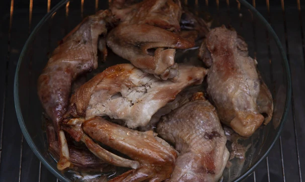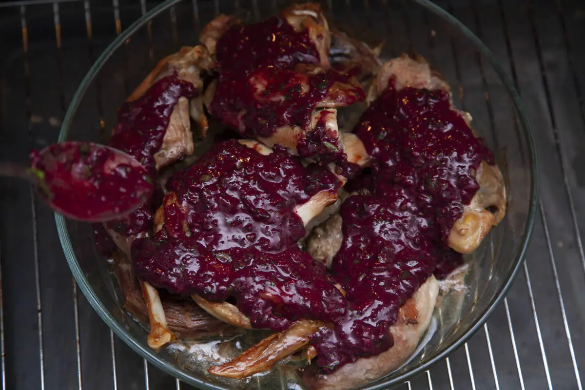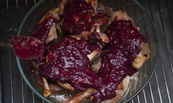 Частью соуса полейте цесарку, уберите крышку и готовьте еще около 30 минут при 180 ℃. Готовую цесарку подавайте с оставшимся соусом и свежим хлебом.
