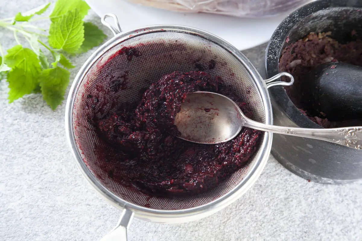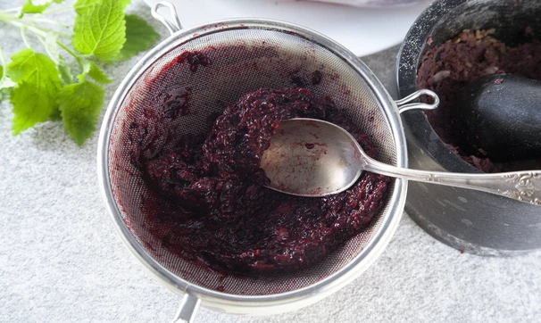 Для соуса размороженную ежевику протрите через сито, чтобы избавиться от косточек. Ежевика легко протирается при помощи ложки.