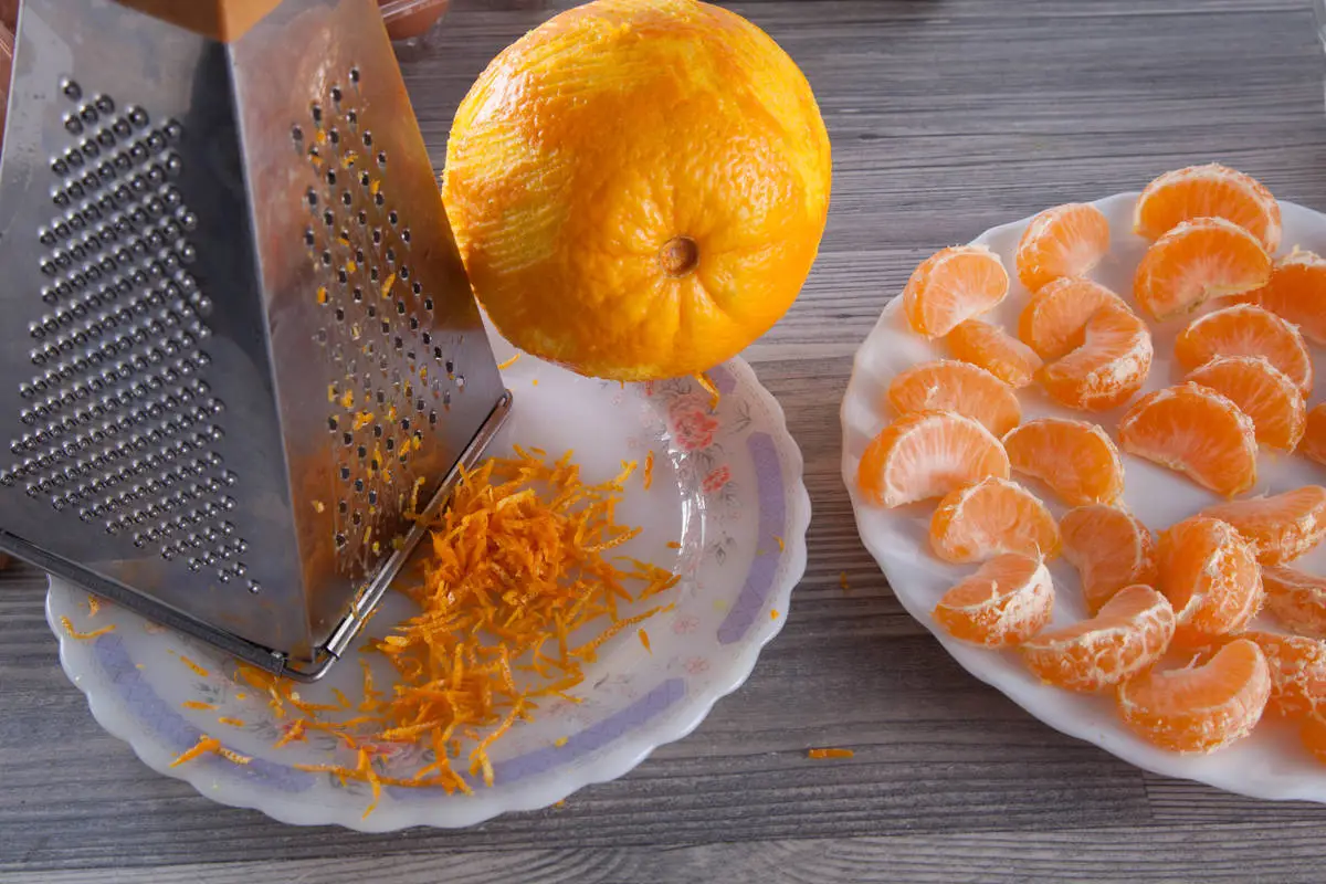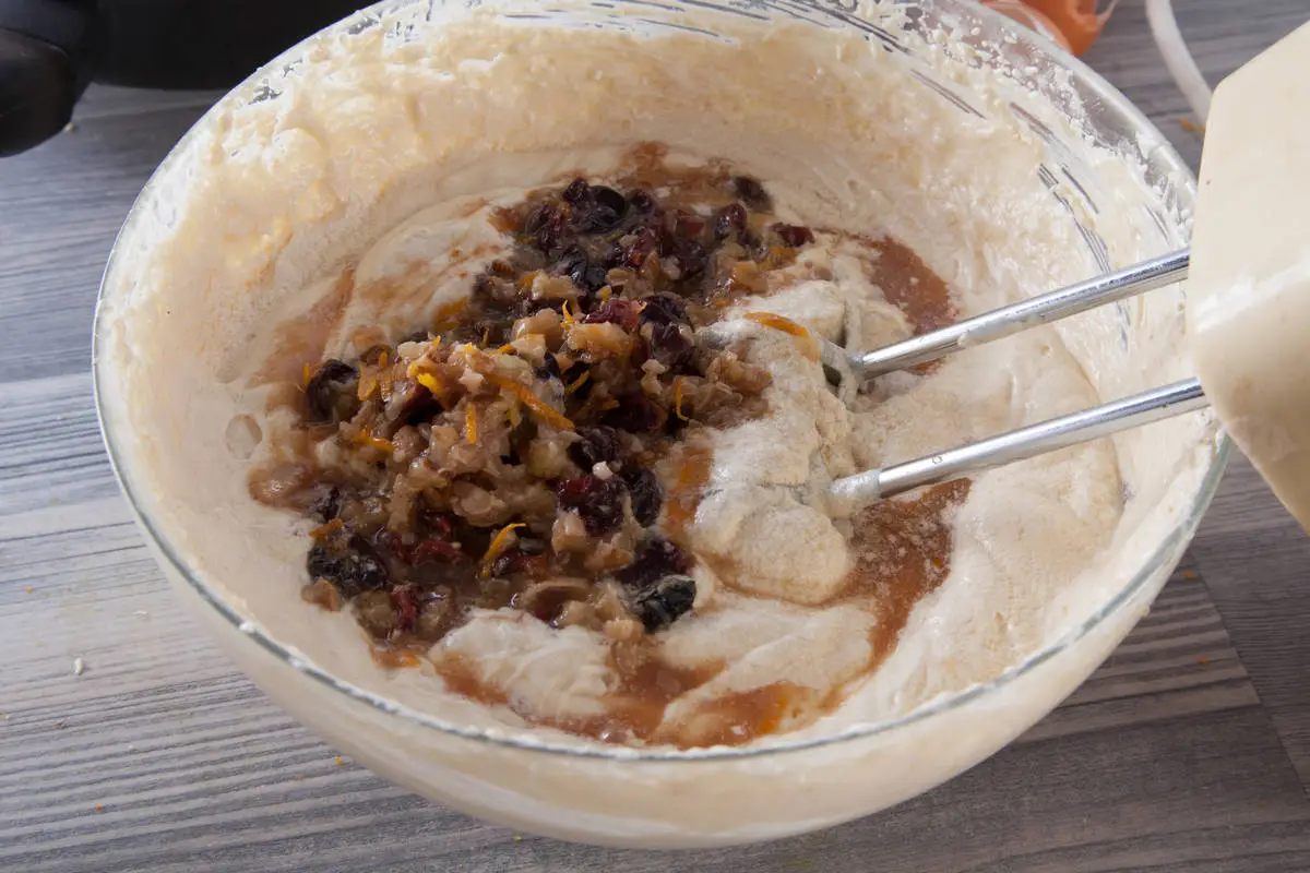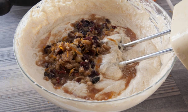 Добавьте цельнозерновую муку и разрыхлитель, перемешайте, затем добавьте дольки мандаринов, вишню вместе с соком, цедру и рубленые орехи.