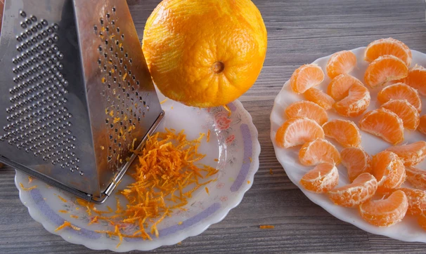 Мандарины очистите и разберите на дольки. Апельсин помойте и снимите цедру мелкой теркой, разотрите цедру с чайной ложкой сахара. Из апельсина выжмите сок, вишню помойте и залейте соком. Второй апельсин очистите и нарежьте кружочками толщиной около 5 мм.