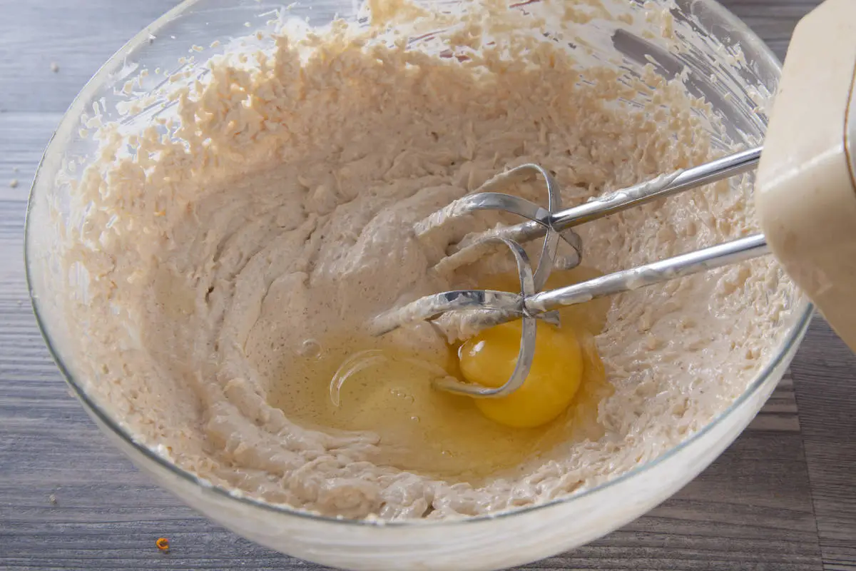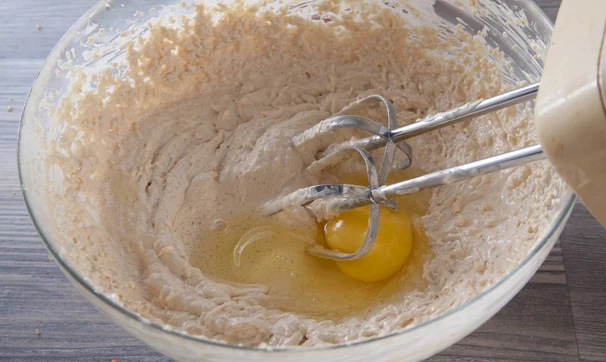 Масло тщательно взбейте с сахаром, затем добавляйте яйца по одному, каждый раз тщательно взбивая.