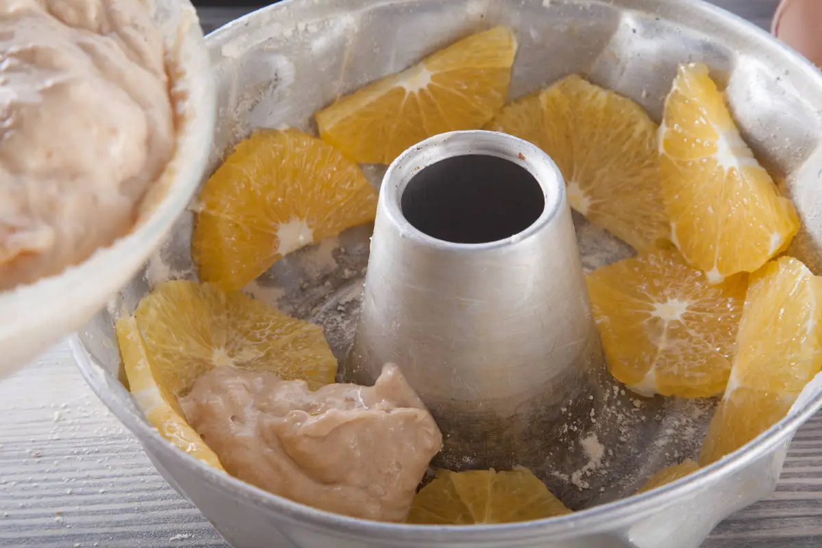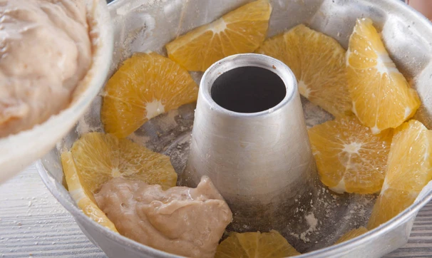 Форму для выпечки (подойдет круглая или для кексов) смажьте маслом и посыпьте мукой, на дно или по бокам формы выложите нарезанные на кружочки апельсины. Залейте в форму тесто и выпекайте в разогретой до 180 градусов духовке в течение 40–45 минут (готовность проверить зубочисткой). После того, как пирог остынет, переверните его на тарелку.