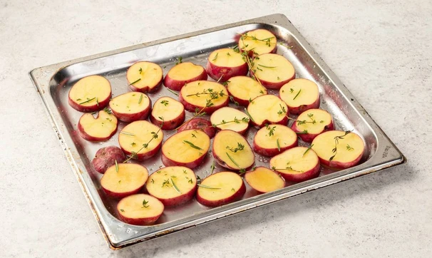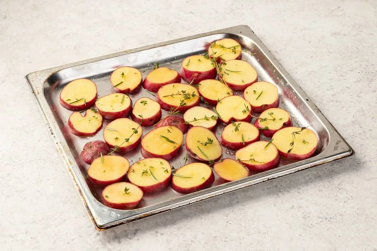 Картошку и батат вымойте щёткой, нарежьте кружочками около 1 см в толщину, посыпьте солью, полейте столовой ложкой оливкового масла. Перемешайте, выложите на противень вместе с веточками тимьяна и розмарина, запекайте при 180 °C, пока подготавливаете цыплят.
