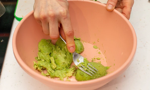 Авокадо очистите от кожуры, мякоть разомните вилкой.