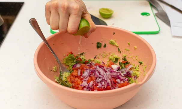 Томат и лук нарежьте мелкими кубиками, кинзу мелко порубите. Соедините всё с авокадо, выжмите сок из лайма, добавьте чуть-чуть оливкового масла. Всё перемешайте, посолите по вкусу.