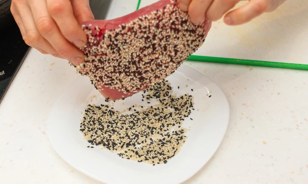 Кунжут насыпьте в плоскую тарелку, обваляйте стейки тунца в кунжуте с одной стороны.