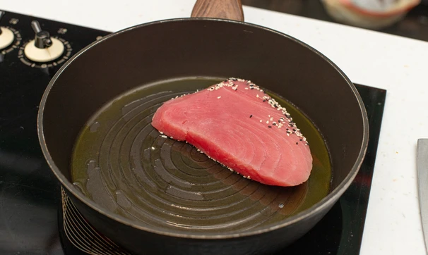 На хорошо разогретой сковороде с оливковым маслом обжарьте стейки тунца с двух сторон по 2-3 минуты.