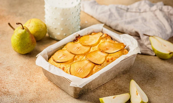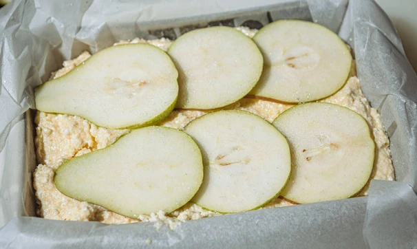 Выложите тесто в форму, смазанную маслом. Грушу нарежьте тонкими ломтиками и слегка вдавите в тесто, выложив поверх.