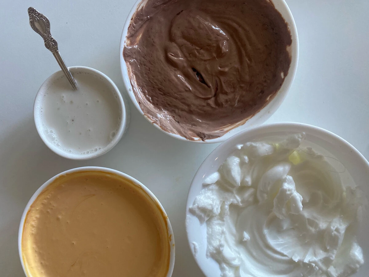 В обе смеси добавьте взбитые белки, также разделив их поровну. Вмешайте белки аккуратно с помощью лопатки.