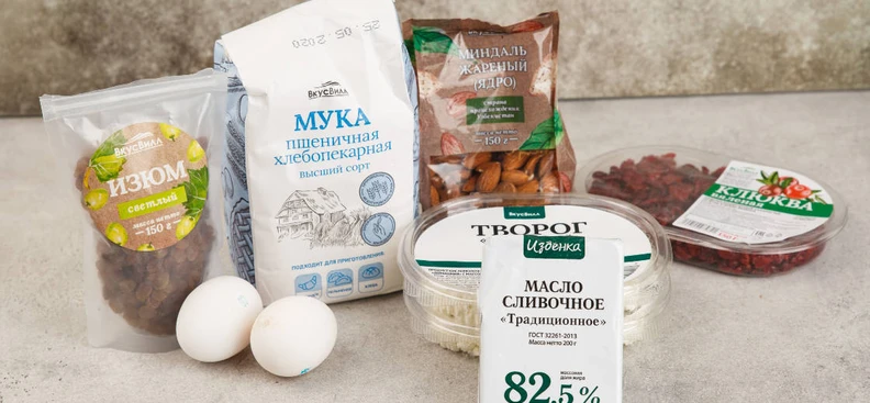 В рецепте используются товары из категорий: Молочные продукты, яйцо; Масла, соусы, специи, сахар и соль; Орехи, чипсы и снеки; Крупы, макароны, мука