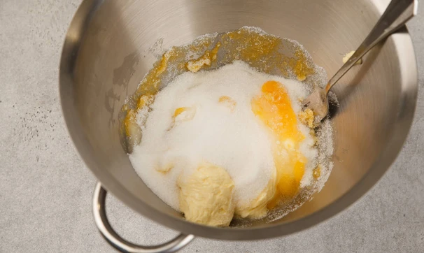 Взбейте миксером размягчённое сливочное масло с сахаром до однородности, затем добавьте яйца и взбейте до пышного крема. Добавьте творог и продолжайте взбивать на высокой скорости.