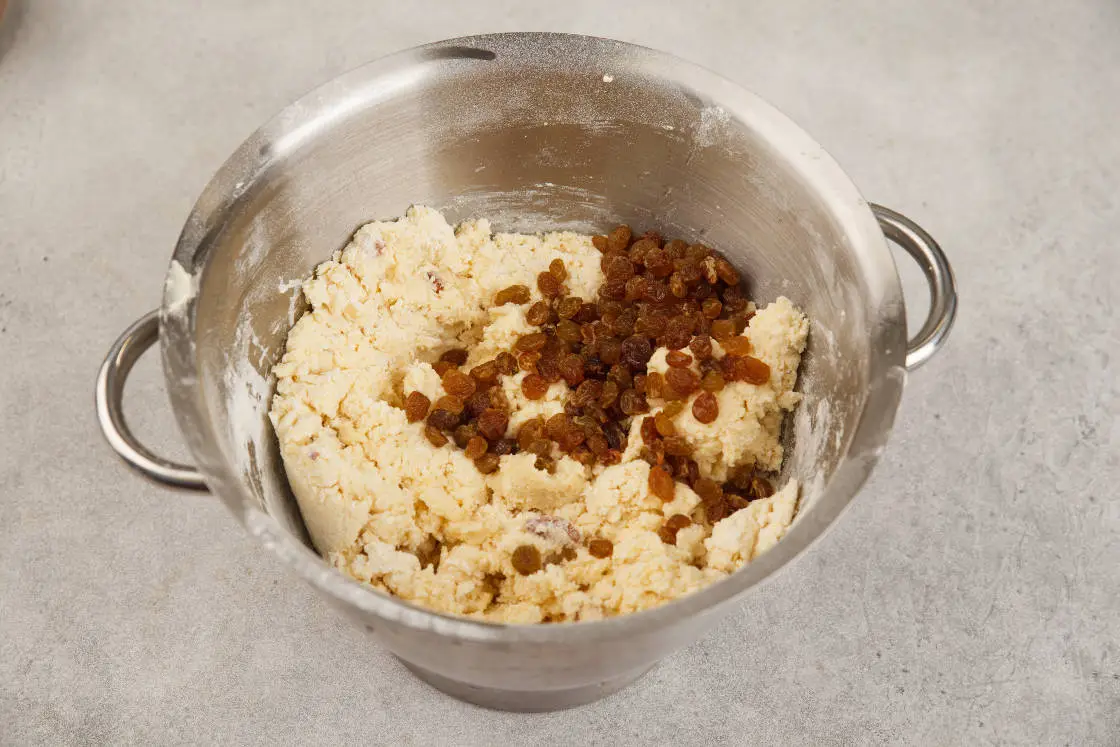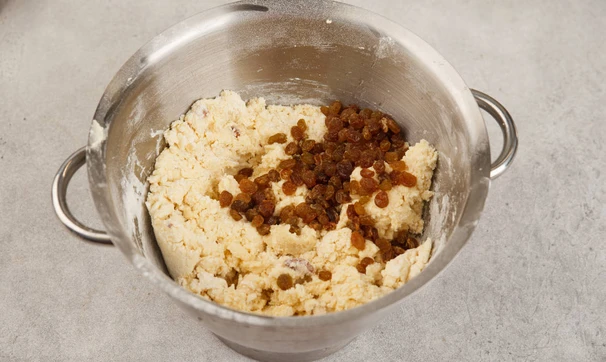 Всыпьте просеянную муку с разрыхлителем, размешайте, затем добавьте орехи, изюм, клюкву, натрите цедру апельсина и вмешайте в тесто на невысокой скорости. Оставьте тесто на 20-30 минут.