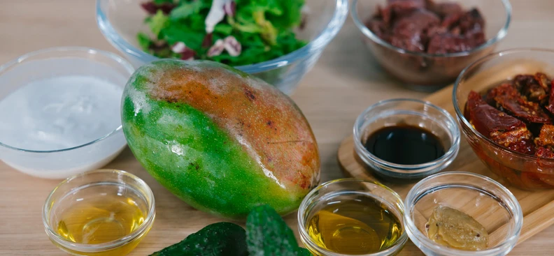 Выложите на тарелку зелень, овощи, манго.