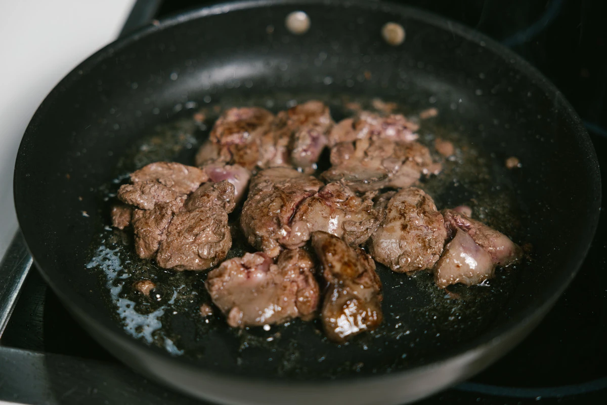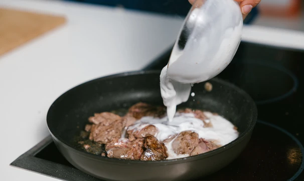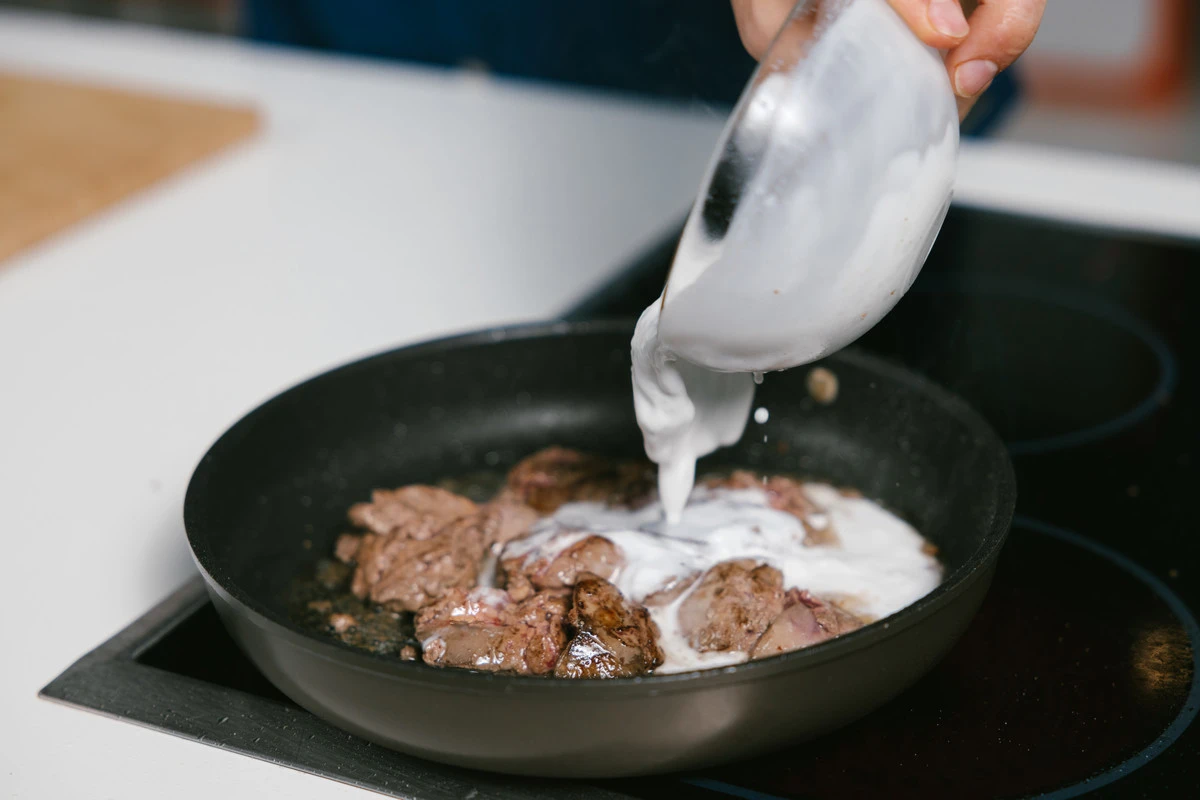 Посолите и поперчите печень, а затем вылейте в сковороду кокосовые сливки и убавьте огонь.