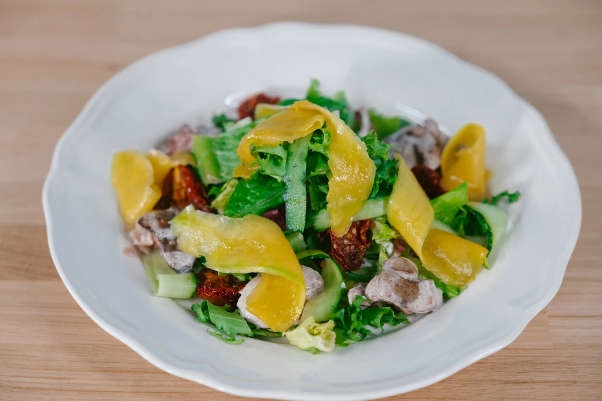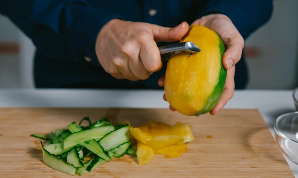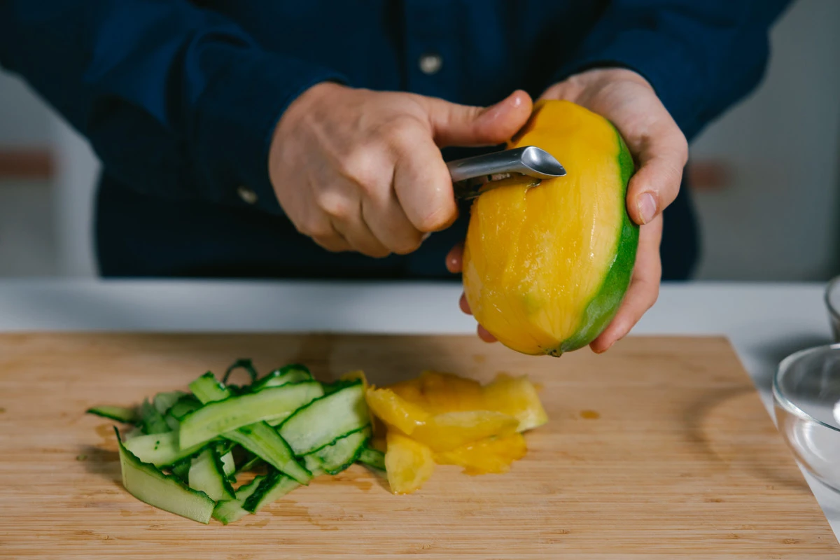 C помощью овощечистки нарежьте манго и огурец на тонкие длинные слайсы. Вяленые помидоры измельчите произвольно.