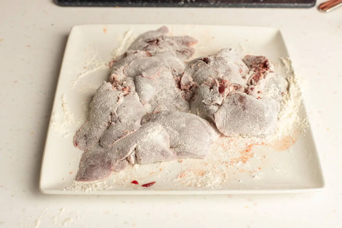 Печень обваляйте в смеси муки с солью и перцем и обжарьте на растительном масле на среднем огне 5 минут до золотистой корочки. Затем накройте крышкой и подержите ещё 5 минут.
