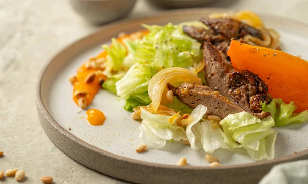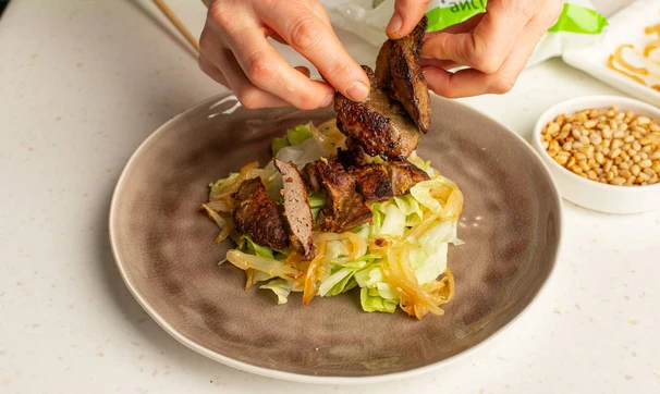 Соберите салат: на подушку из листьев айсберга выложите лук и печень, дольки хурмы и соус из хурмы.