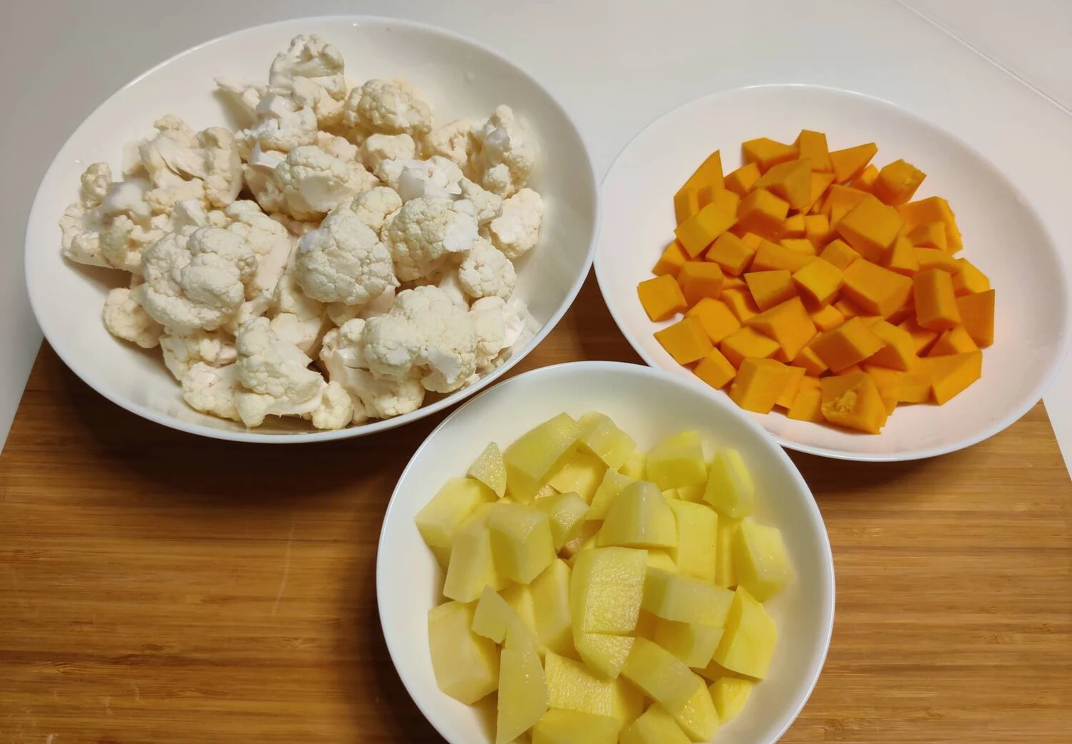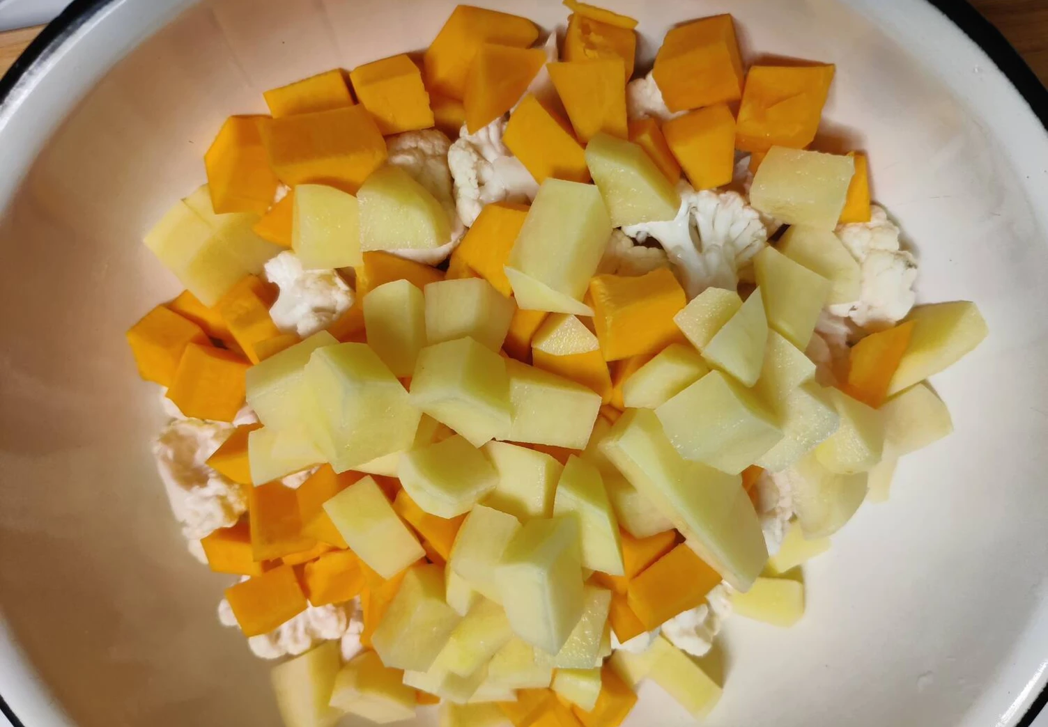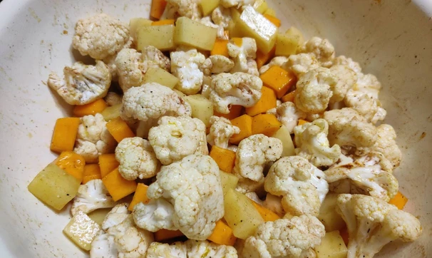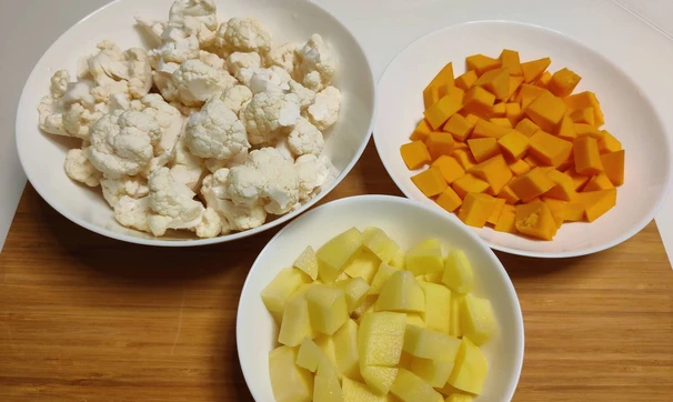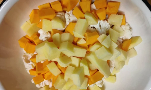 Тыкву, картофель помыть, почистить и порезать на кубики. Цветную капусту помыть и разрезать на соцветия.