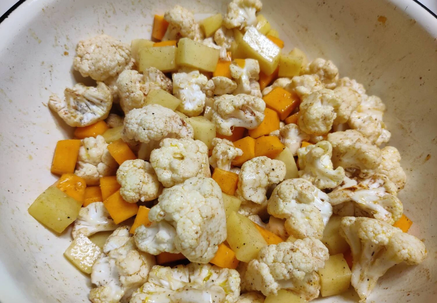 Посыпать овощи солью и специями: чёрный перец, кориандр молотый, паприка (примерно по 1/2 ч. л. каждой). Затем всё перемешать, добавить растительное масло и снова перемешать.