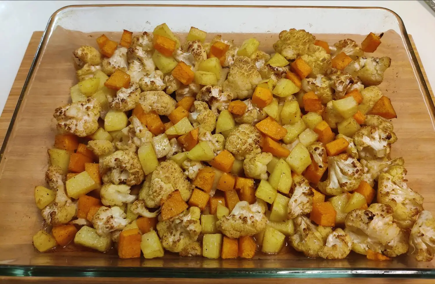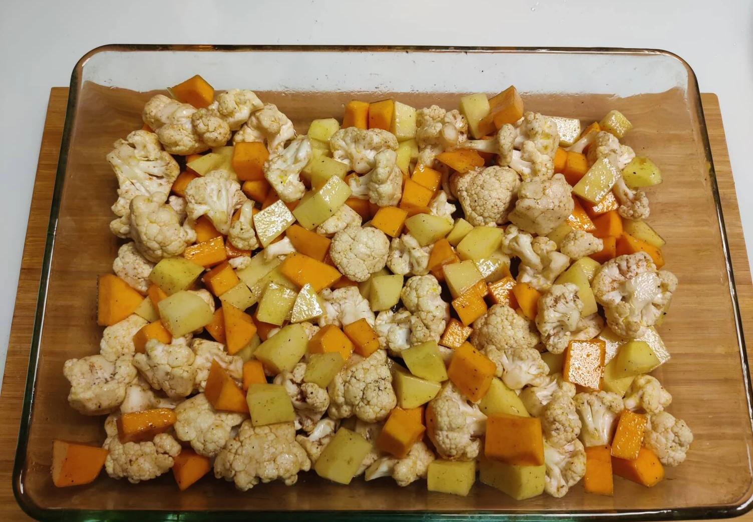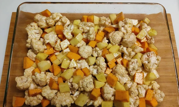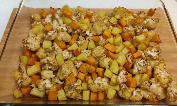 Поставить форму с овощами в разогретую духовку и прикрыть крышкой или листом пергаментной бумаги. Запекать при температуре 180 градусов около 40-50 минут (ориентироваться по цветной капусте). В конце приготовления (примерно за 10 минут до окончания) крышку или лист пергаментной бумаги можно убрать для подпекания с небольшой корочкой (по желанию).