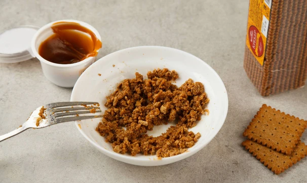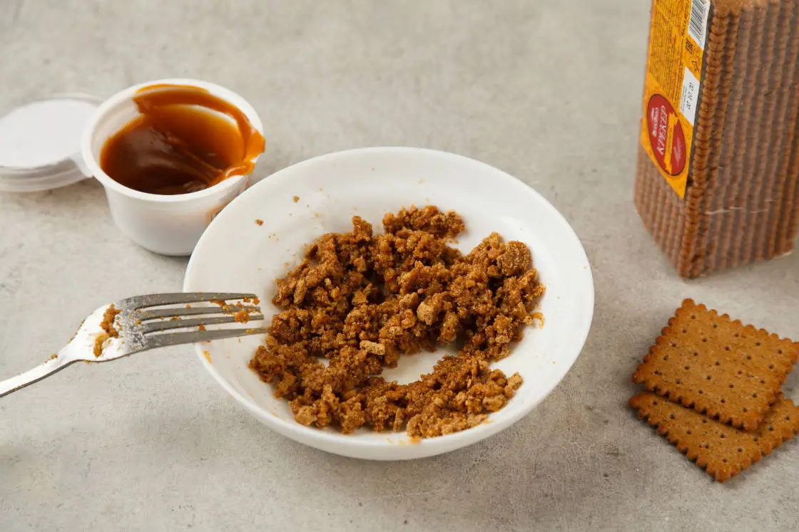 Крекеры поломайте в крошку и смешайте с чайной ложкой карамели.