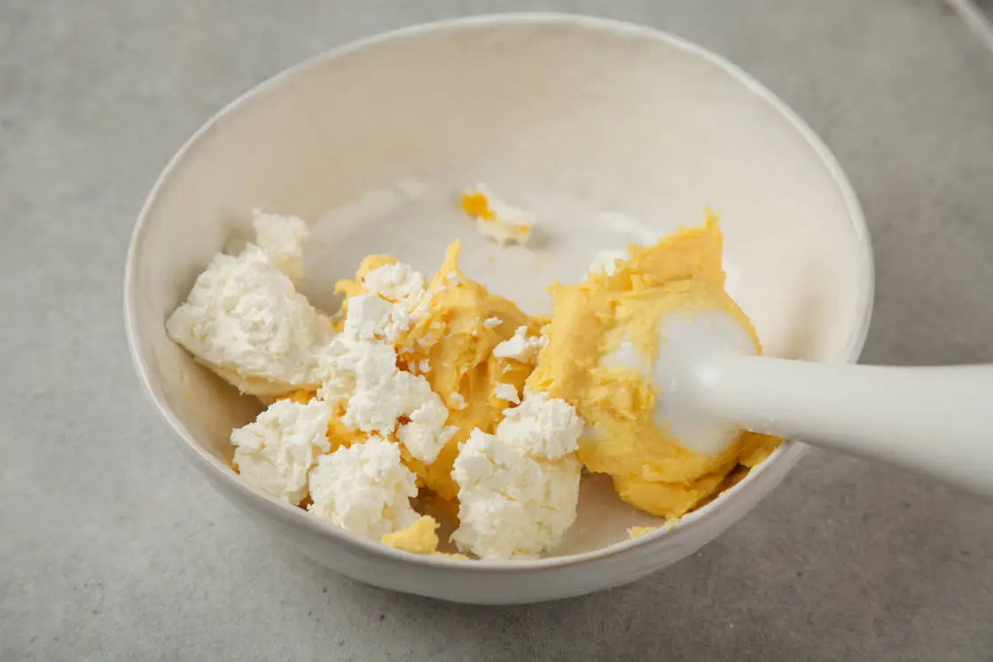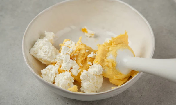 100 г пюре смешайте с КремЧизом и 1 чайной ложкой карамели, 50 г пюре — с оставшейся карамелью.