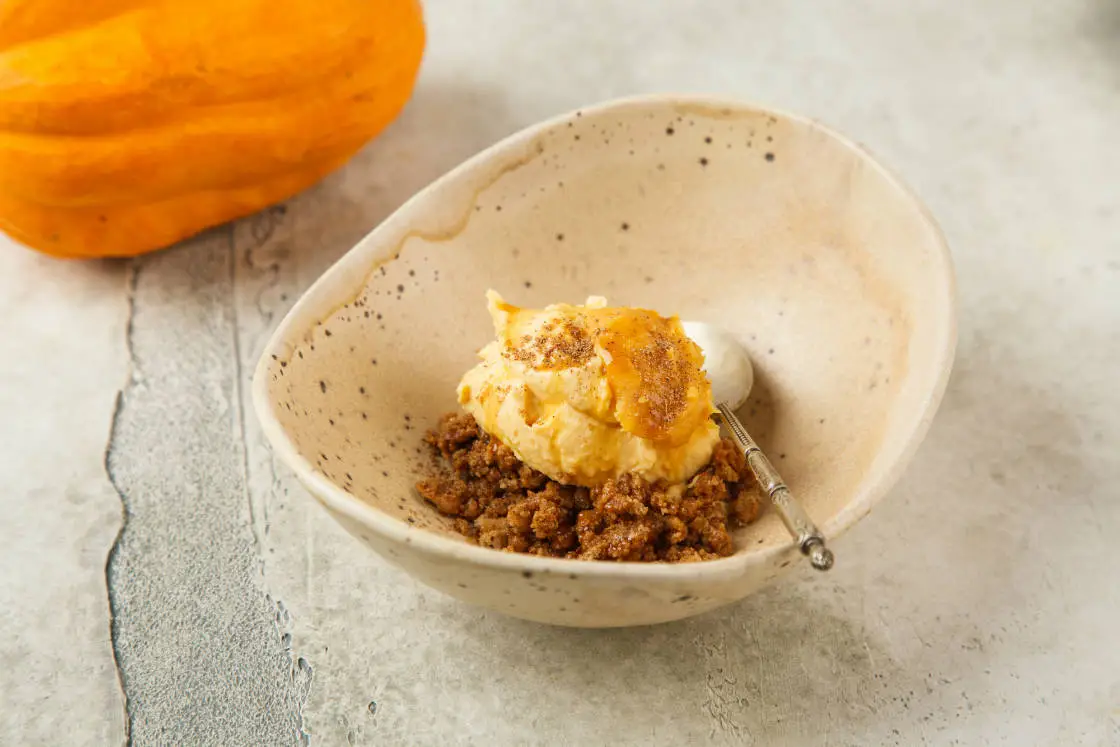 Соберите десерт в тарелочках или стаканах слоями: нижний слой — крошка из крекеров, затем тыквенно-сливочный слой, сверху карамельно-тыквенный слой. Десерт готов! Можно хранить в холодильнике 1 день.
