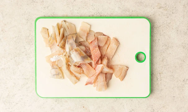 Филе проверьте на наличие косточек, промойте. Нарежьте небольшими кусочками.