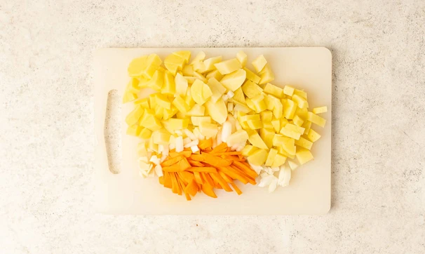 Овощи почистите, лук нарежьте мелкими кубиками, морковь — соломкой, картофель — средними по размеру кубиками.