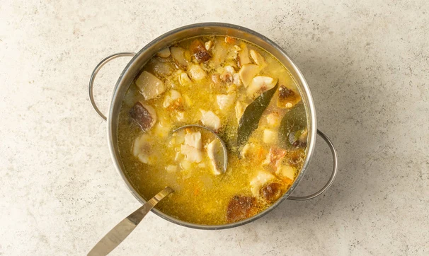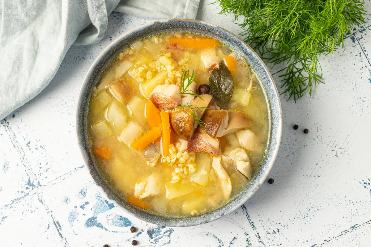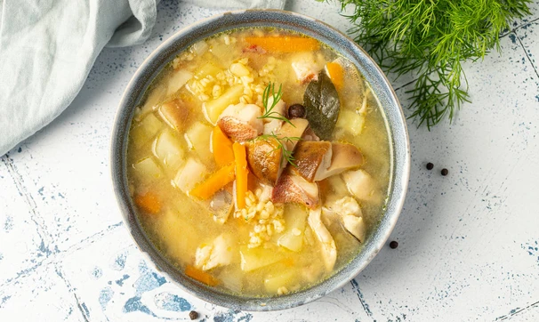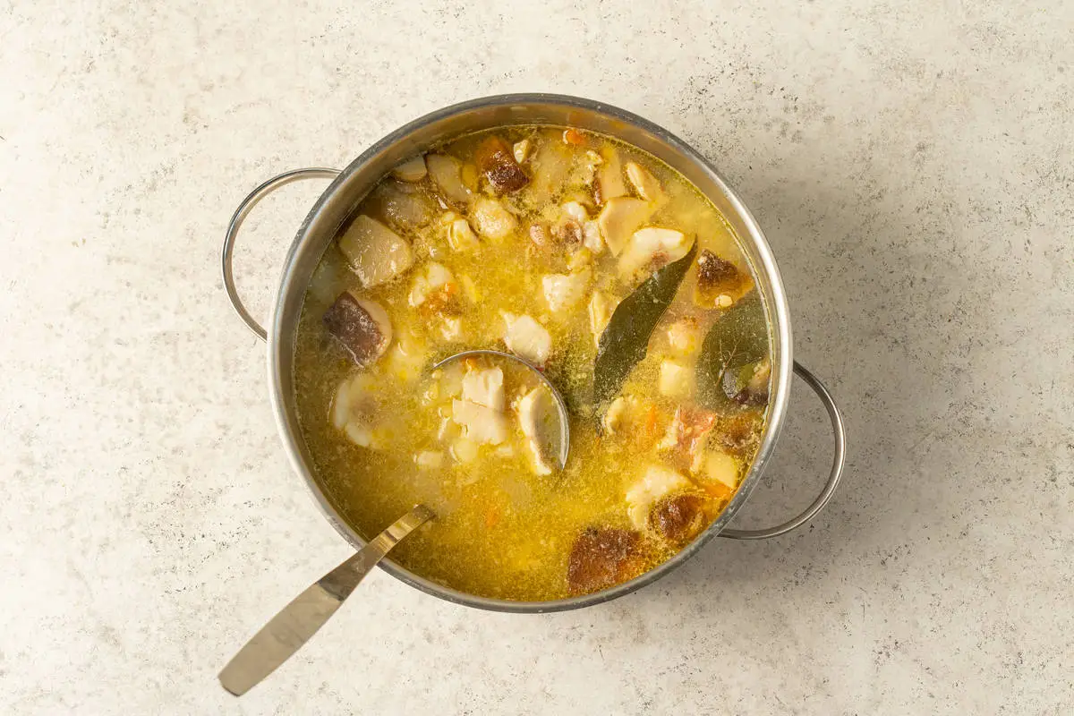 Наваристая и сытная уха из двух видов рыбы с деликатным ароматом лесных грибов — это что-то потрясающее. Помимо судака мы взяли филе окуня, чтобы сделать вкус рыбного бульона более насыщенным. А вы можете готовить такую уху только из судака, и тоже получится очень вкусно.