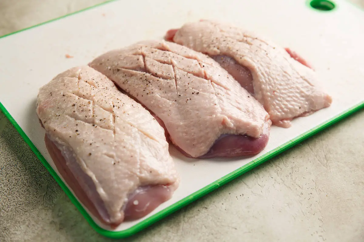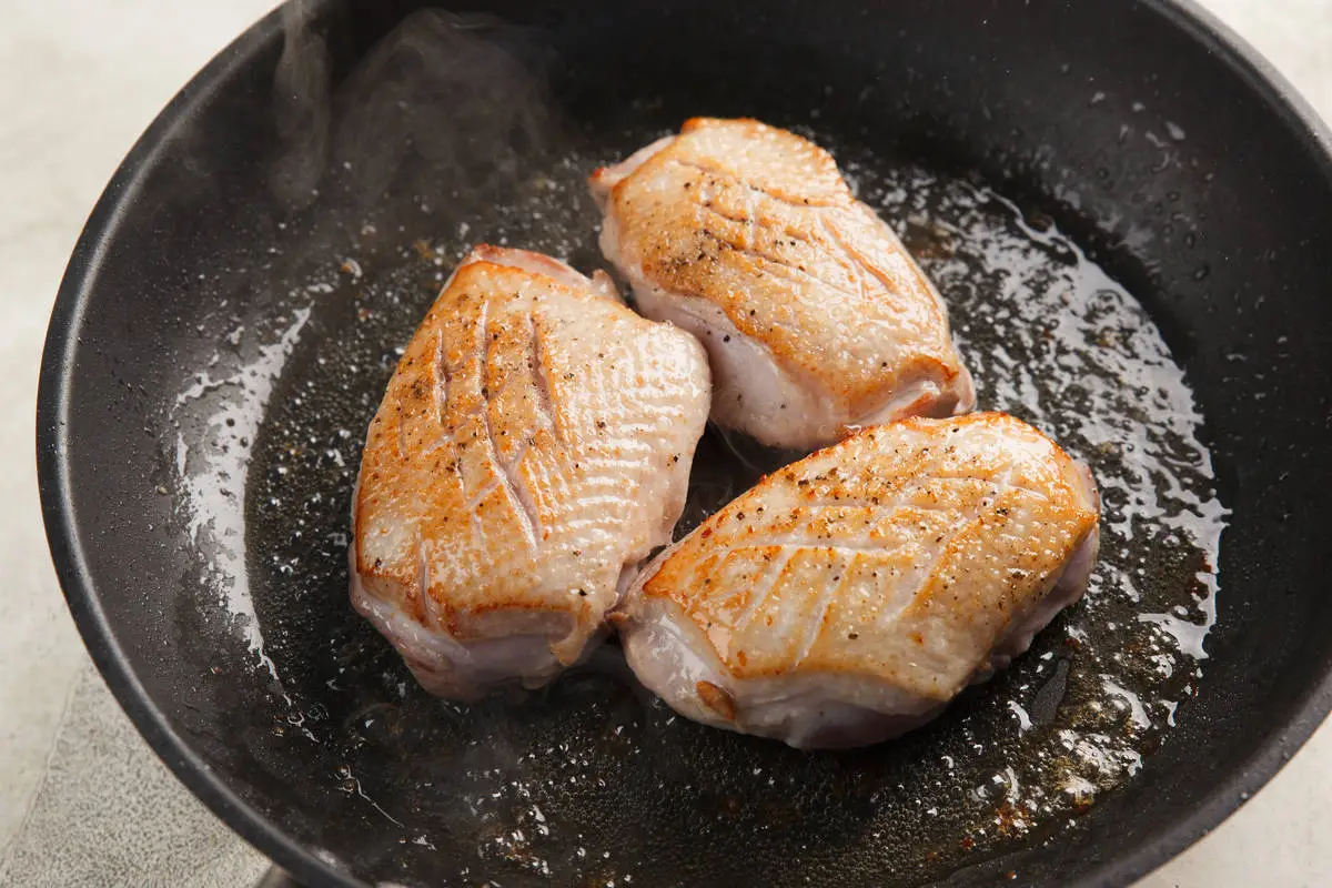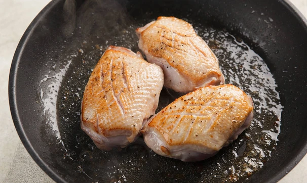 Уложите грудки кожей вниз на горячую сухую сковороду и жарьте до золотистой корочки. Затем переложите в противень кожей вверх и доведите до готовности в разогретой до 180°С духовке около 10 минут.
