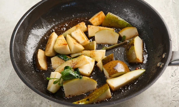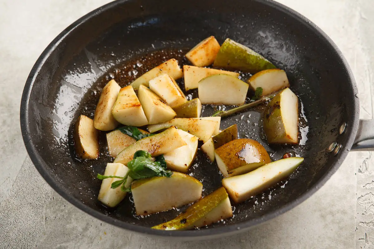 Груши нарежьте средними кубиками, выложите в оставшийся от утки жир. Добавьте соевый соус, мёд и выжмите сок апельсина. Готовьте на среднем огне до мягкости, в конце добавьте листики мяты.