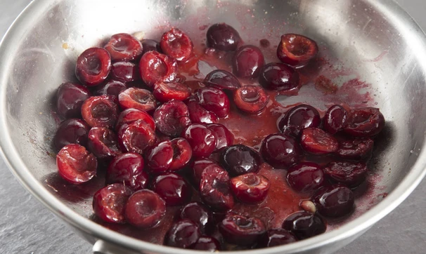 Черешню очистите от косточек, нарежьте половинками. В сковороде растопите сливочное масло с сахаром, слегка обжарьте черешню, влейте немного лимонного сока, посолите и поперчите, готовьте еще минуту, затем снимите с огня.
