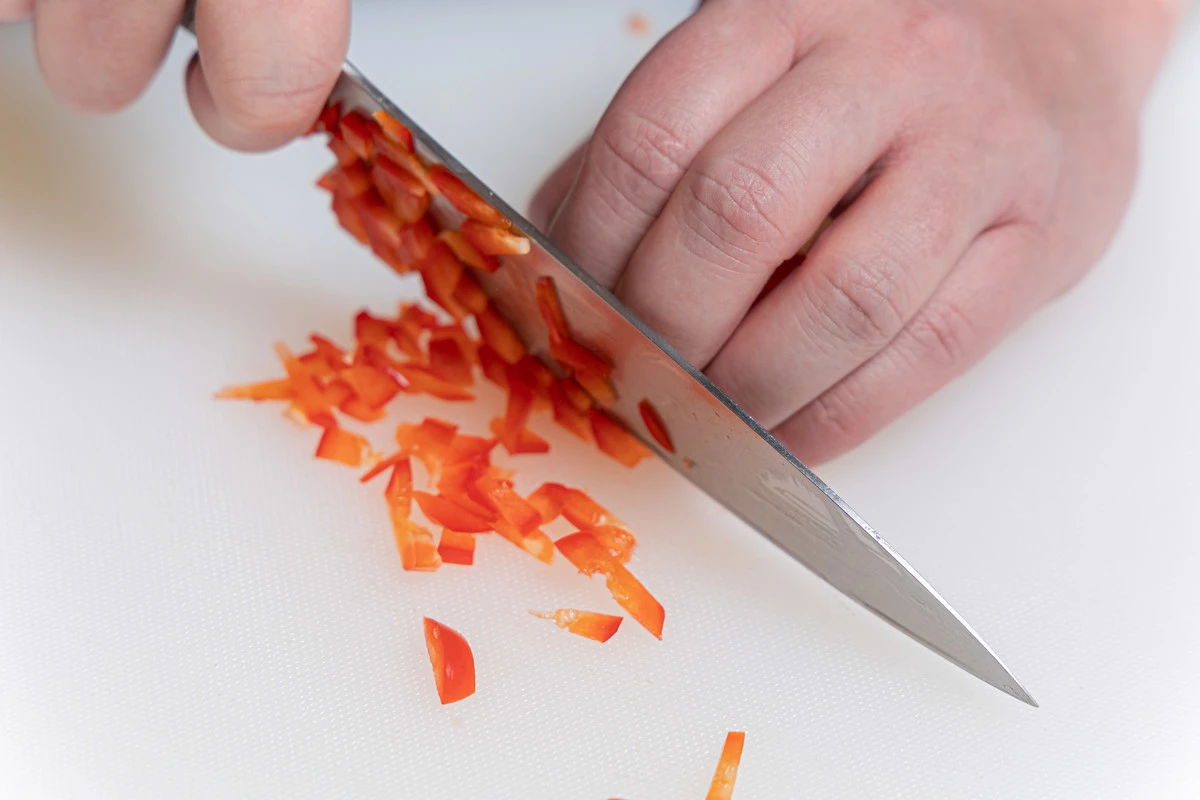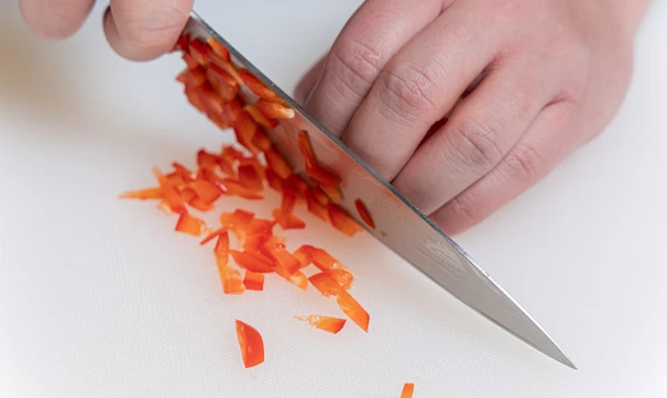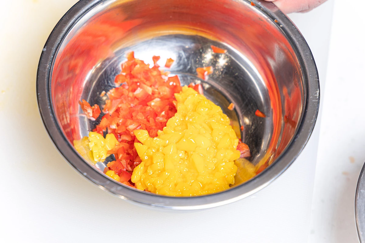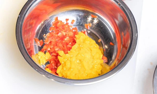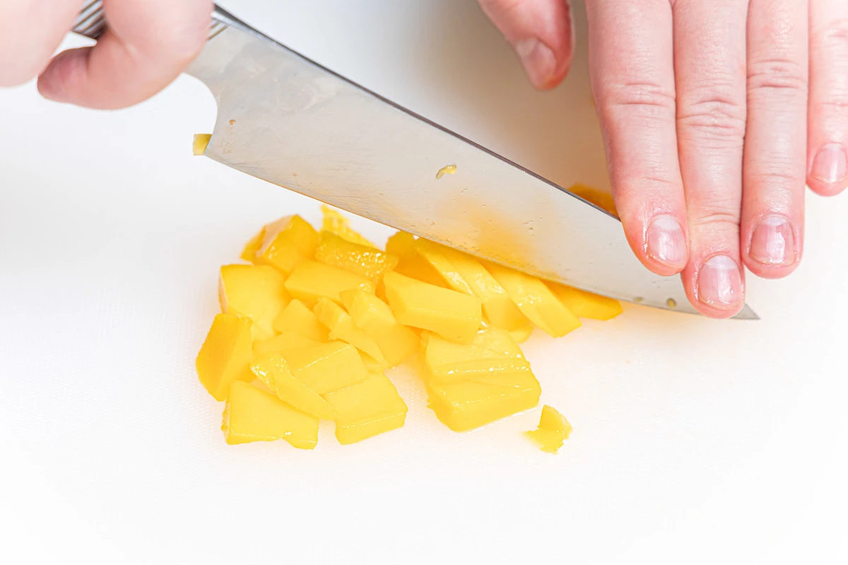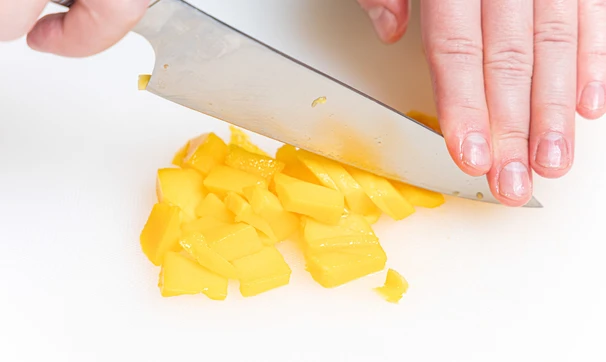 Мякоть манго очистите от кожуры и мелко нарежьте.