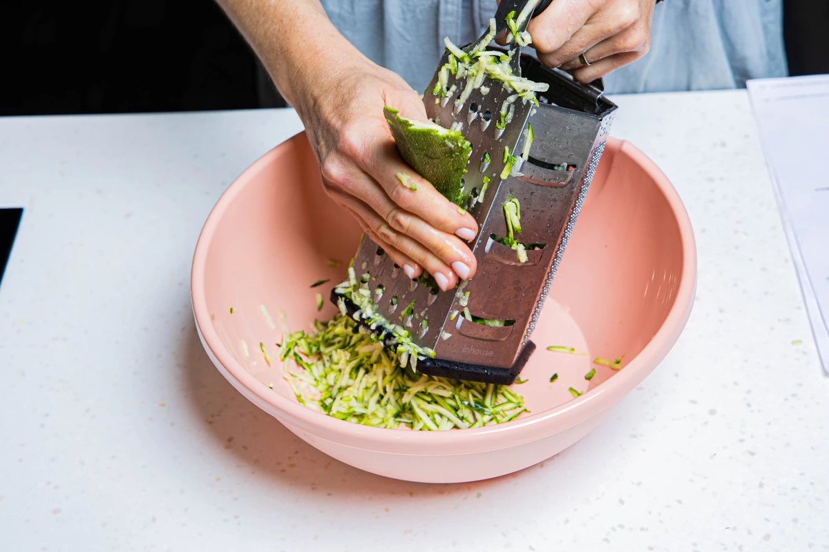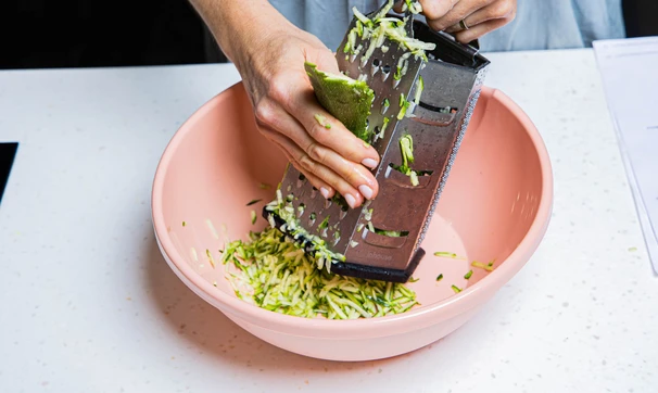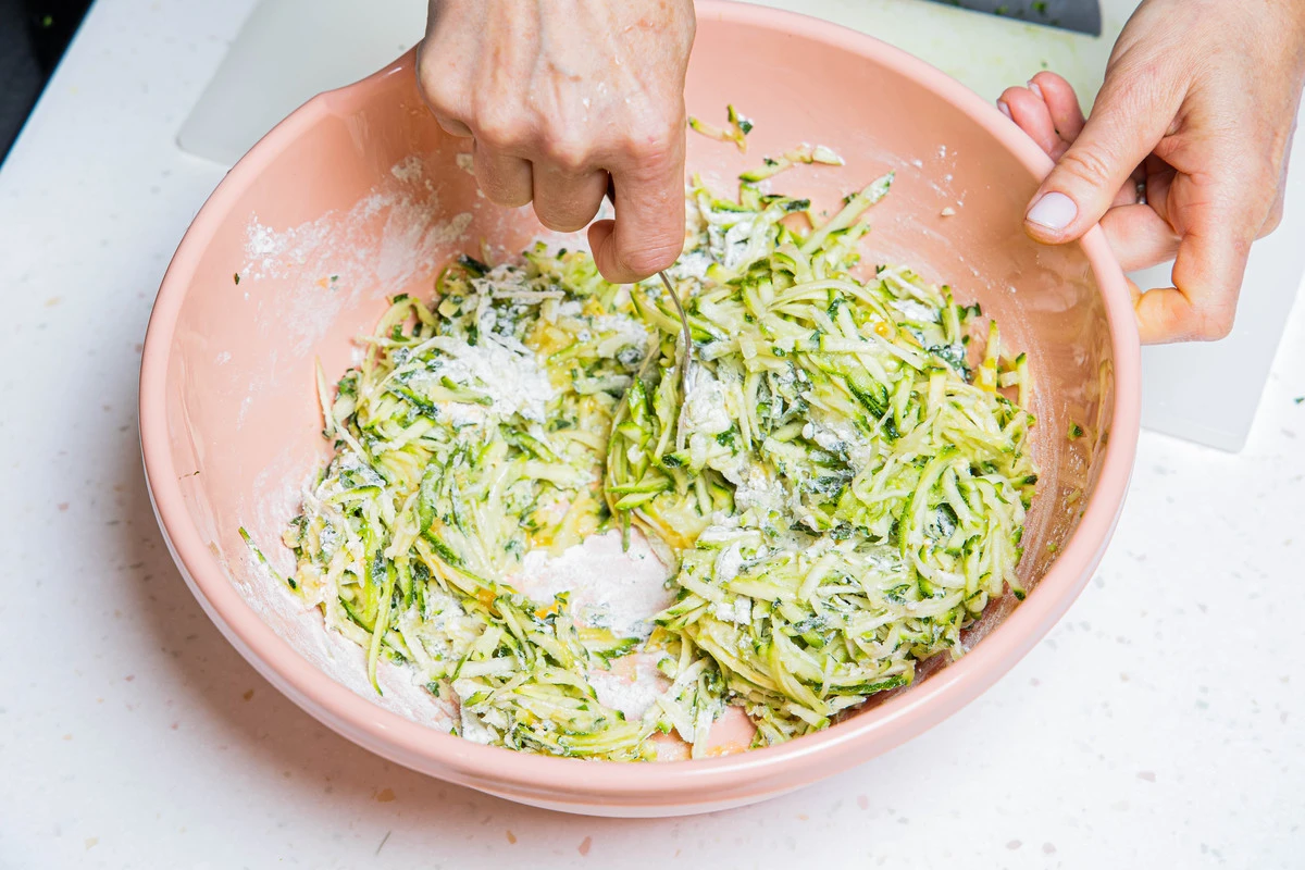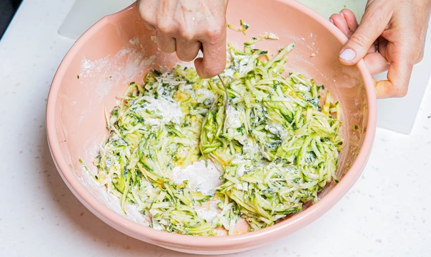 Цукини помойте, удалите плодоножки. Измельчите на крупной тёрке.