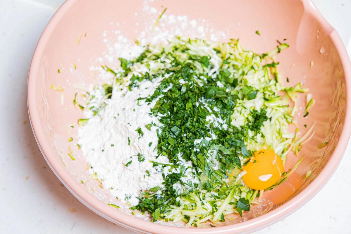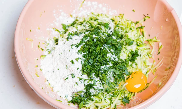 К тёртым цукини добавьте яйца, муку, разрыхлитель, соль. Петрушку мелко нарежьте и также положите в миску.