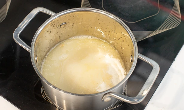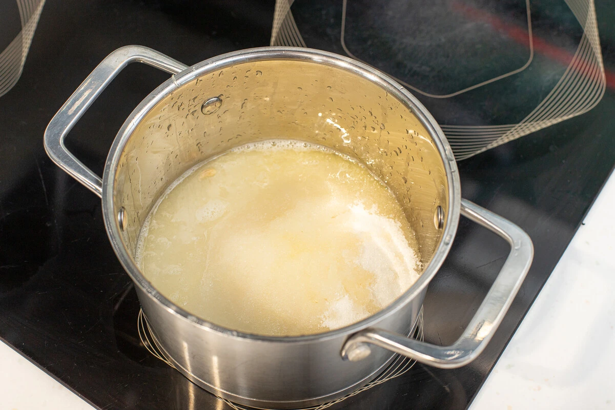 Поставьте на огонь и прогревайте до полного растворения сахара, должны образовываться крупные пузыри.