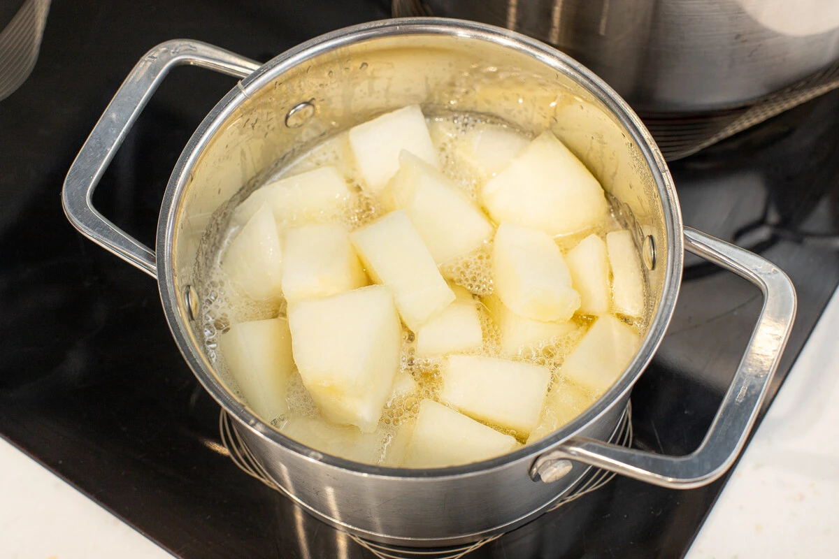 Положите дыню в кастрюлю с сахарным сиропом и готовьте 5 минут. Готовое варенье остудите и храните в холодильнике в банке до 1 месяца. Если варить его в 3 приёма, каждый раз доводя до кипения, проваривая 5 минут и остужая, то в конце такое варенье из дыни можно закатать в банки и хранить в тёмном прохладном месте. Однако тогда сахар стоит взять в пропорции 1:1 с дыней.