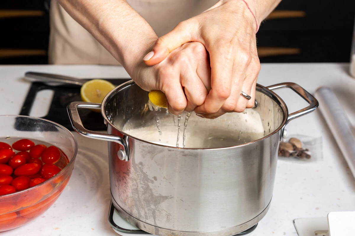 У лимона удалите косточки и выжмите сок в кастрюлю с сахаром.