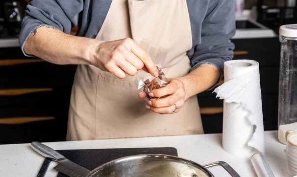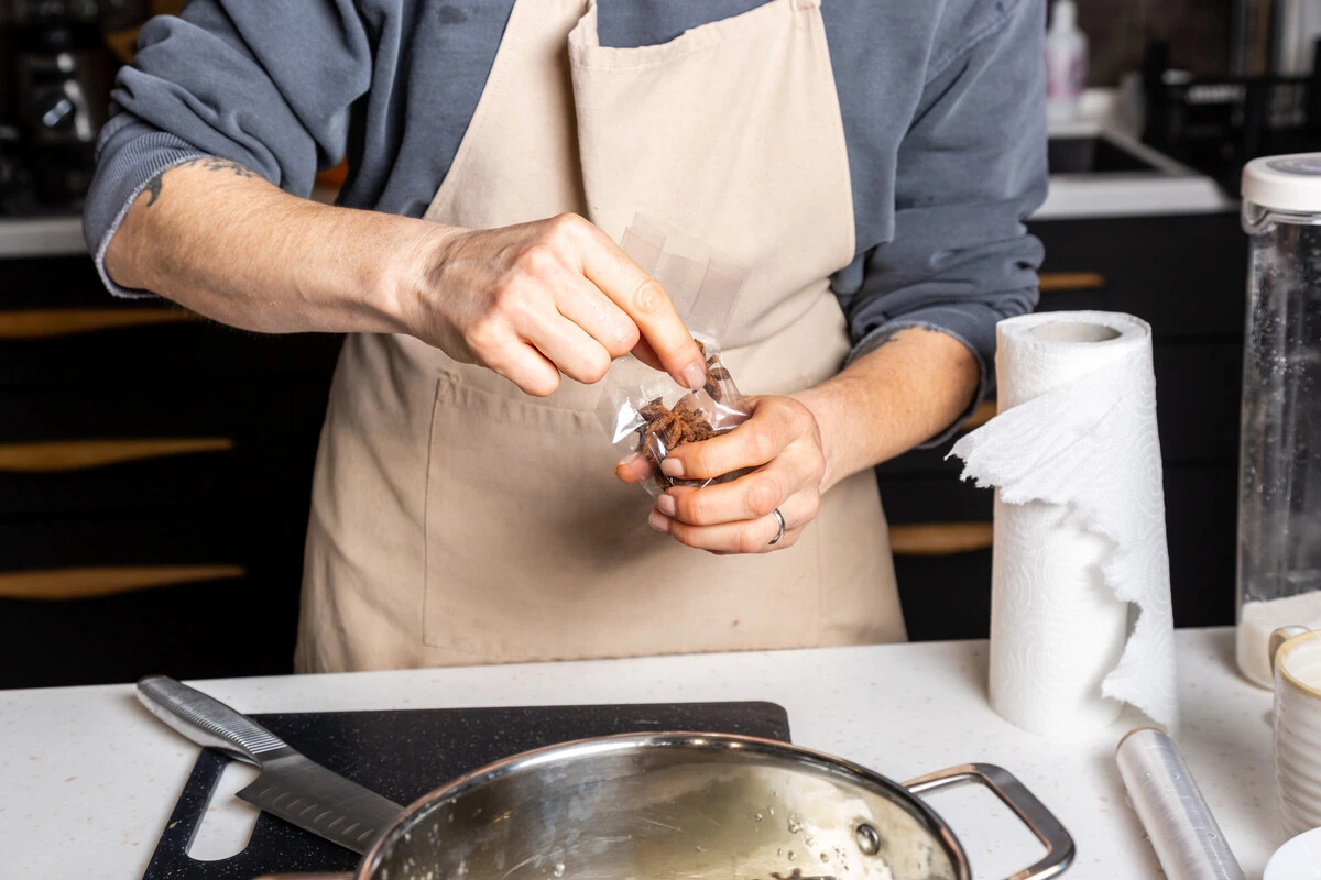 Положите специи. Поставьте на огонь и нагревайте до растворения сахара. Перемешайте и доведите до кипения.