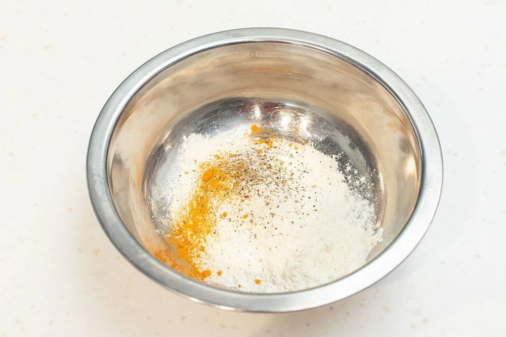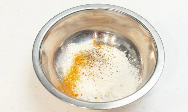Смешайте в миске муку, соль, молотый чёрный перец и куркуму.