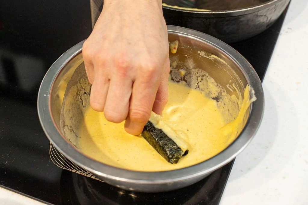 Обжаривайте, пока кляр не прихватится — примерно по 2 минуты с каждой стороны. Если у вас останутся листы нори, используйте их для сервировки: например, их можно положить на тарелку, а сверху выложить брусочки тофу в кляре. Подавайте, по желанию присыпав кунжутом, с соусом терияки, соевым или рыбным.