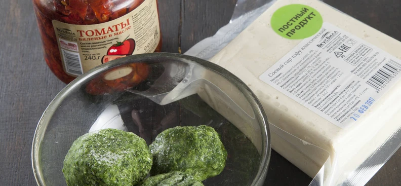 В сковороде разогрейте оливковое масло (или используйте масло от вяленых томатов), выложите замороженный шпинат, накройте крышкой и дайте разморозиться на небольшом огне.