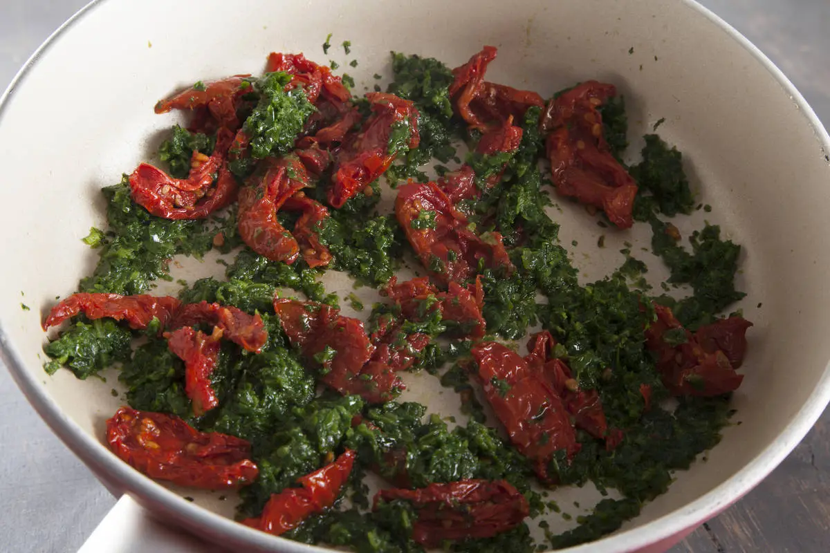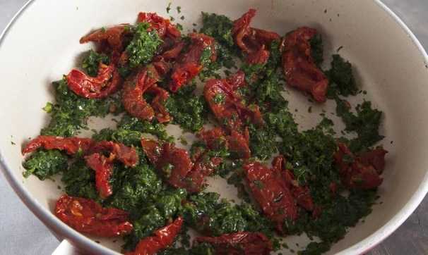Вяленые томаты выньте из масла, нарежьте кусочками и добавьте к шпинату, увеличьте нагрев. Готовьте ещё минуту.