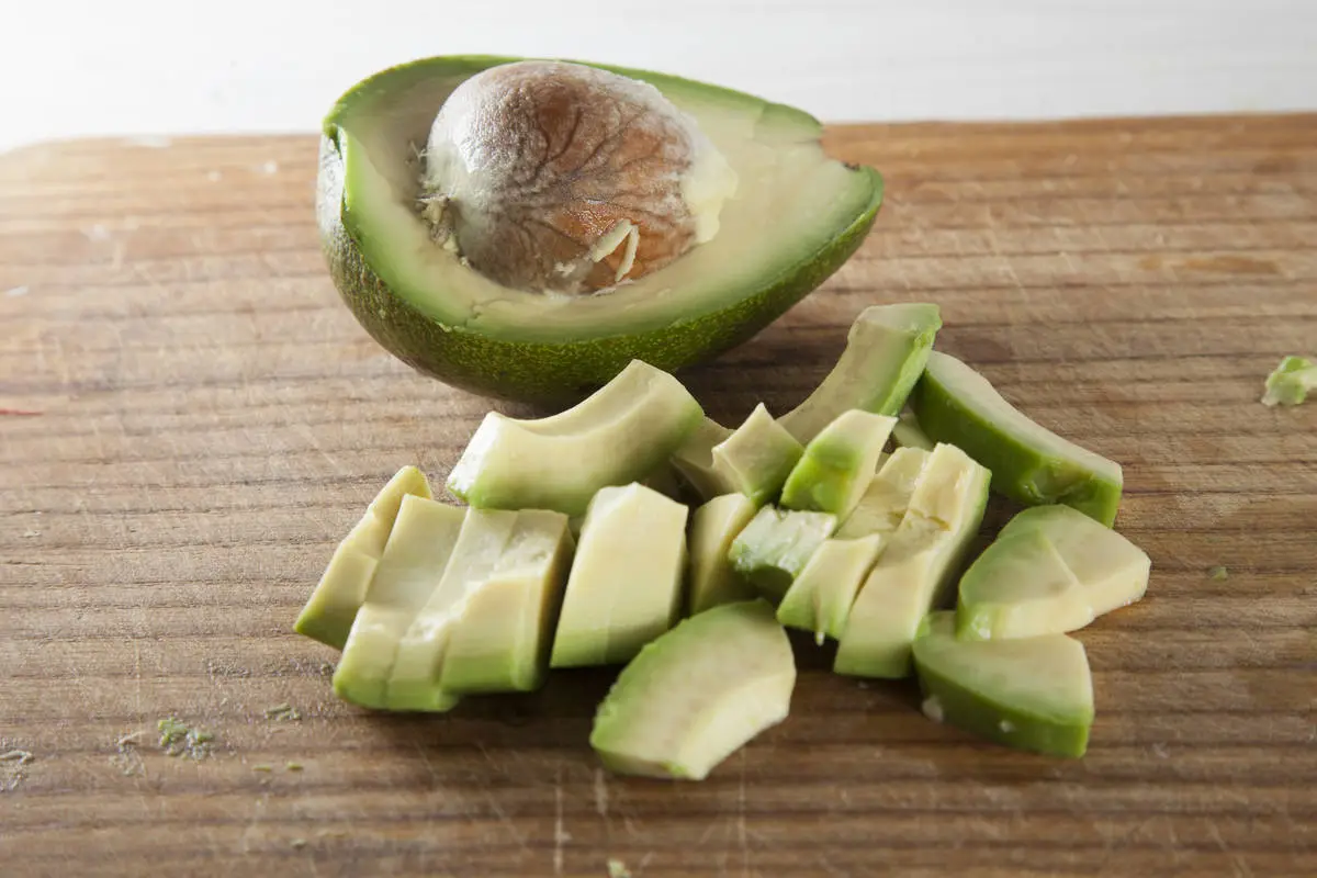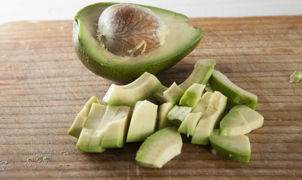 Спелое авокадо очистите и нарежьте тонкими ломтиками, полейте лимонным соком, посолите, поперчите и перемешайте.