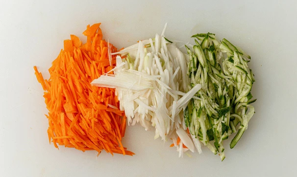 Дайкон и морковь очистите и измельчите на тёрке для корейской моркови. Если такой тёрки нет, можно использовать обычную или нарезать тонкими брусочками при помощи острого ножа. Огурец также измельчите на тёрке.