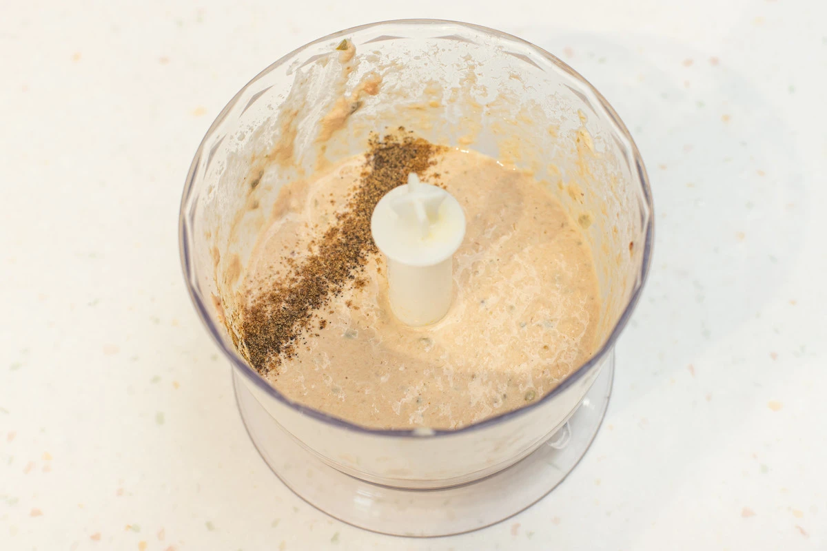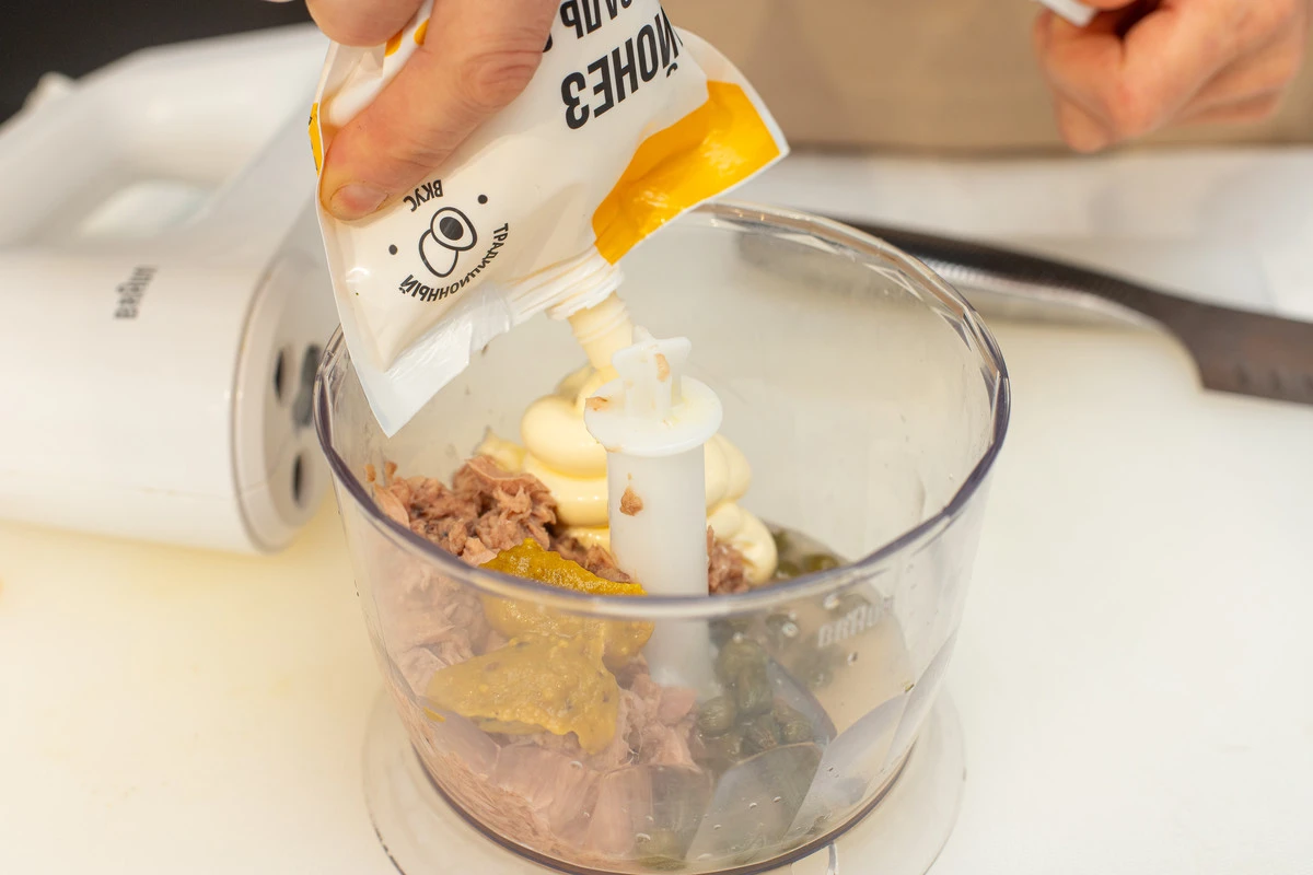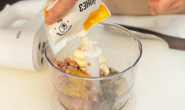 Для этого рецепта лучше брать тунца в масле, но можно и в собственном соку. Слейте масло или жидкость (если у вас тунец в собственном соку) и положите кусочки в чашу блендера. Добавьте каперсы, дижонскую горчицу, сок лимона, майонез и щепотку чёрного молотого перца. Также по желанию можно добавить чайную ложку соевого соуса, половину чайной ложки вустерского соуса и щепотку сахарной пудры.